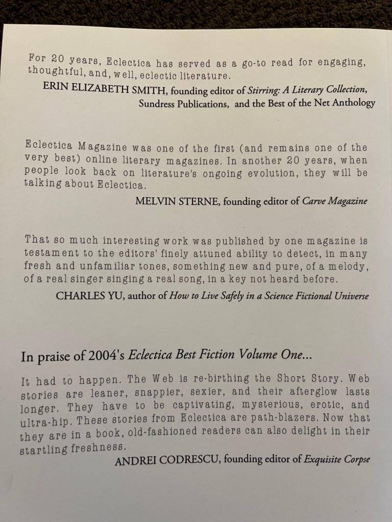 “An anthology of best nonfiction pieces selected by David Ewald from the archives of Eclectica Magazine, http://www.eclectica.org, celebrating 20 years online.”